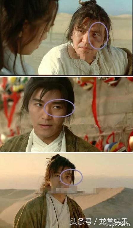 【大话西游】影片第16分钟左右,至尊宝晚上被青霞揍了一圈,一只眼睛变成熊猫眼。两人下山去逛集市的时候,至尊宝的熊猫眼恢复正常了。影片第21分钟左右,两人回到沙漠,紫霞说天快黑了,去找姐姐了。这时候至尊宝的熊猫眼又出现了。