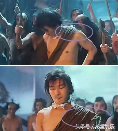【大话西游】至尊宝在找菩提老祖给他的乾坤袋,这时他肩上的衣服并没有盖住肩膀。紧接着一个镜头,衣服把肩膀盖住了。