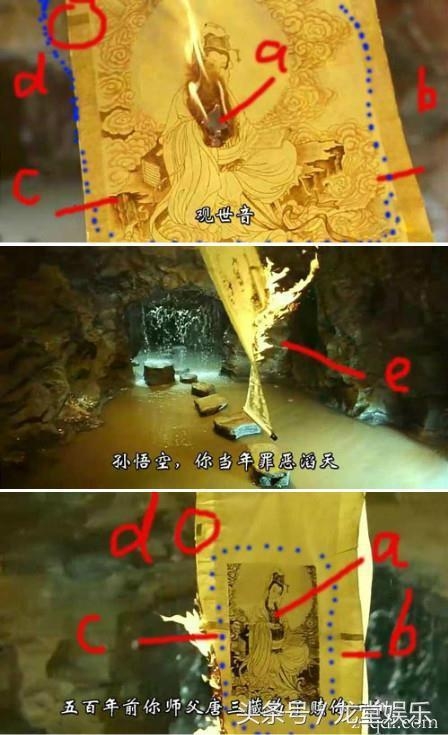 【大话西游】至尊宝拿起观音画像时,画着火了,是从a处,也就是观音的胸部开始着火的,但是到了第二张图中,却从e处燃烧。又看第三张图,火居然又神奇般从左面烧起来了。而且第三张图中,画像无缘无故多了两张胶布。