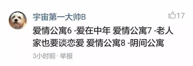 而网友已经把爱情公寓后续系列的片名都起好了,爱情公寓6-爱在中年、爱情公寓7-老人家也要谈恋爱、爱情公寓8-阴间公寓,到了第8部应该可以判断是一部恐怖悬疑片。