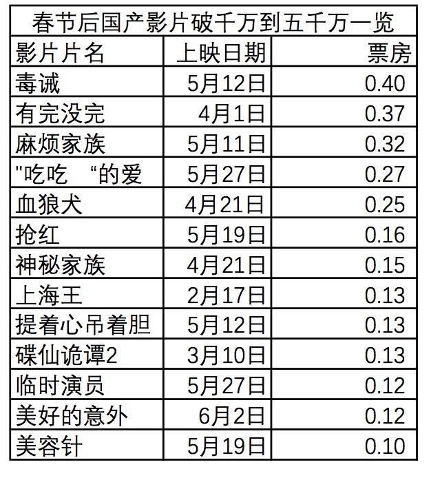 除了在“三大战役”皆“阵亡”的国产片之外,几部并没有在小长假上映的国产片反而获得了不错的收益。