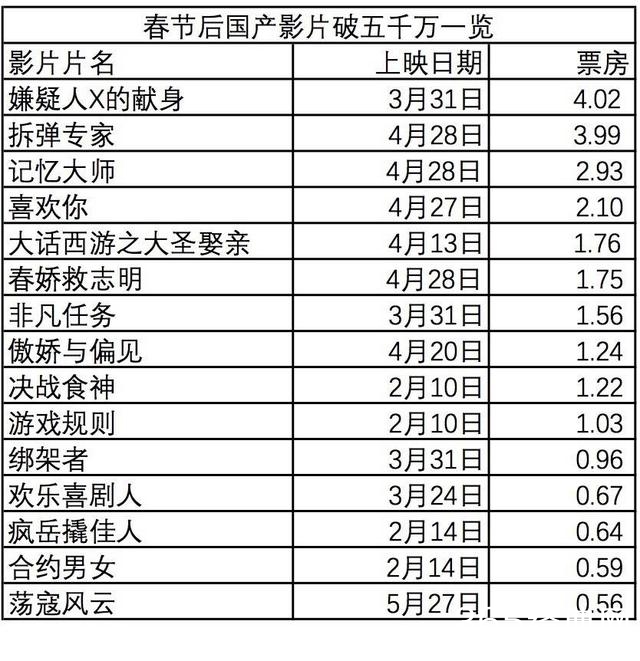 不过即便如此,春节档后国产片的乏力也凸显无疑,从下面的表可以看到,春节档后国产影片票房最高的是《嫌疑人X的献身》,仅仅4亿出头。《拆弹专家》票房未能突破4亿,对于博纳、寰亚和首次入局的小米影业也未能如意。《记忆大师》虽然此次由票房号召力更强的黄渤加盟,同时影片也全景在泰国拍摄,但高昂的片酬、拍摄费用和营销花费,都使得最终3亿不到的成绩看起来实在让万达乐不起来。