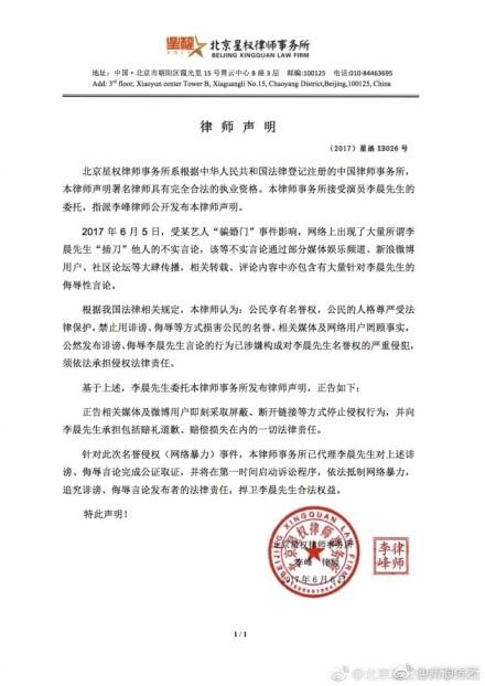 6月6日李晨在微博发布律师函,称网络上一些针对于他“插刀”印小天的事情,给他带去了困扰,要求停止这样的言论,但是网友却纷纷不领情,微博下的骂声一片!