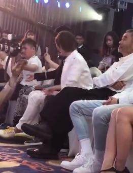 旁边的人感觉是聊得蛮好的感觉,郭敬明独自低头,不知道在思考着什么