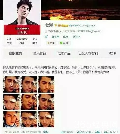 而之前的姜潮也算是一名小有名气的小鲜肉,但是就是一直不火,无意中在微博中用小号发的一篇微博却让他火了,真的是不可思议的一件事。这篇微博都红到了百度百科专门做了一个“哭照九连拍”的词条。