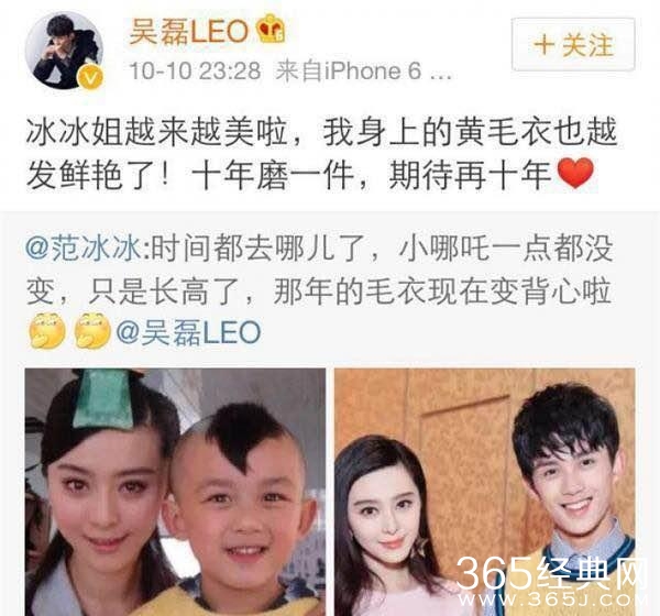 不过最妙的是,吴磊这时隔多年再和范冰冰合影还是黄色毛衣,就连他自己都开玩笑说“十年磨一件”,自己身上的黄毛衣可是愈发鲜艳了,这“同样”的黄色毛衣见同样的人,照片里的两人颜值可都up了不少~