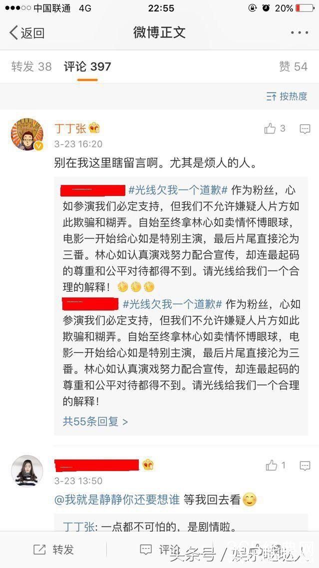 撕番位的事情也不算罕见了,一般就是几方的粉丝在官博下面闹一闹,开个话题轮微博,再@几个出品方。可是林心如家闹的与众不同,她们直接找到了王长田和丁丁张的微博下去刷屏,没错,就是前面出现过的那个和林心如方谈《东宫》项目的光线总裁王长田,还有光线的副总裁丁丁张.