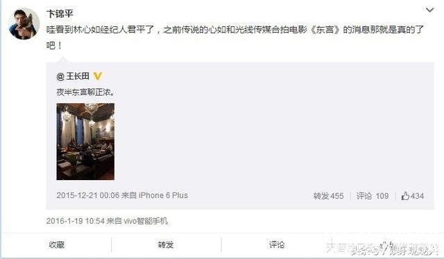 光线总裁王长田当时还发过一张与林心如经纪人谭君平夜谈的照片,配词:夜半东宫聊正浓