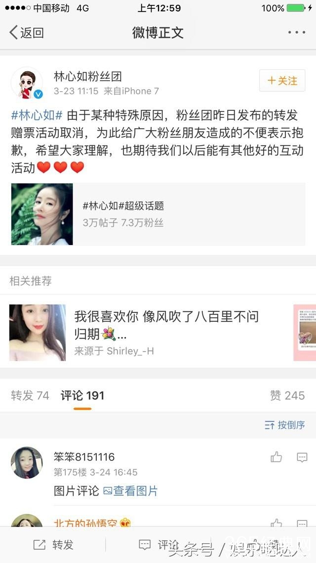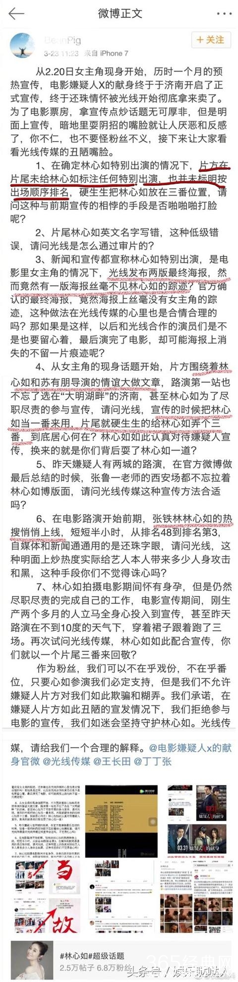 那天是电影嫌疑人预售的日子,所有参与电影的主演们,包括出品方光线,和圈内伙伴都转发了预售的微博,除了林女士。她的官方粉丝团还取消了赠票活动,虽然没有给出理由,但是看了评论也不难知道理由。