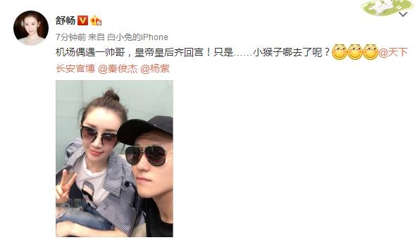 今日演员舒畅发文称:机场偶遇一帅哥,皇帝皇后齐回宫!只是……小猴子哪去了呢?并艾特了天下长安官博、秦俊杰以及杨紫!