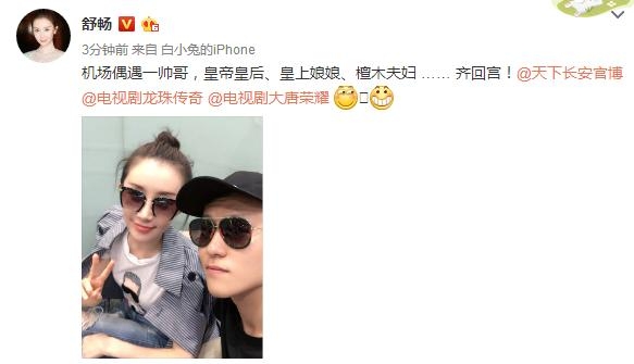 不过随后舒畅又将发布过的内容秒删换上了!换成了:机场偶遇一帅哥,皇帝皇后、皇上娘娘、檀木夫妇 …… 齐回宫!艾特了天下长安官博、龙珠传奇以及大唐荣耀。