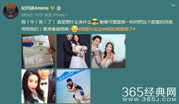 于6月6日,超女纪敏佳在微博上突然宣告自己怀孕了,而且主动晒出自己的验孕结果单,验孕结果单显示出纪敏佳已经怀孕三个月了,并且说道:“真是想什么来什么。”从话语中可以明确察觉超女纪敏佳对于这个突然而来的消息感到非常的激动。