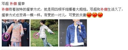 近日有网友发微博称发现邓超和孙俪连握拳的方式都是一样的,就是用四根手指攥着大拇指