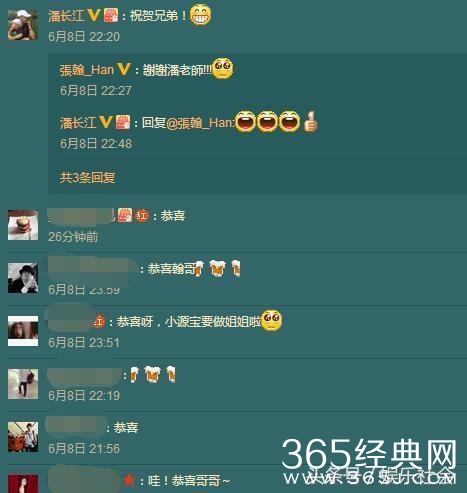 好友潘长江转发评论并送上祝贺,其余网友也纷纷评论留言祝福张翰喜当爹~