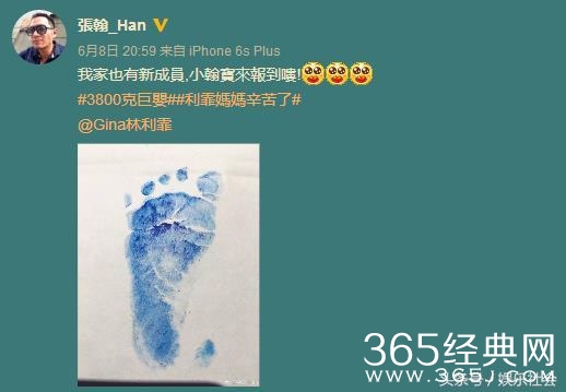 6月8日晚,台湾演员张翰微博晒出一张脚丫照,对外分享晋升人父的喜悦,并写道:“我家也有新成員,小翰寶來報到嘍!#3800克巨嬰##利霏媽媽辛苦了# @Gina林利霏 ”