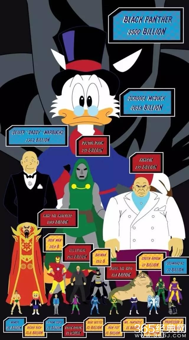钢铁侠身家1240亿美元,蝙蝠侠身家800亿美元,而黑豹的身家则有5000亿美元!土豪中的土豪。