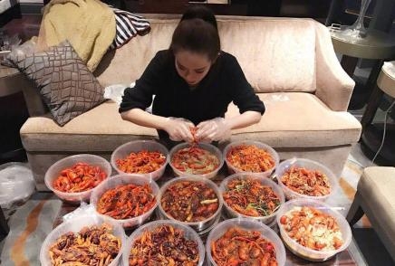戚薇爱吃的画风很清奇!不仅直播吃酸菜鱼,火车上吃肉夹馍,夜宵吃几盆小龙虾,还能演出时疯狂吃面条,这么能吃的戚哥!我服!