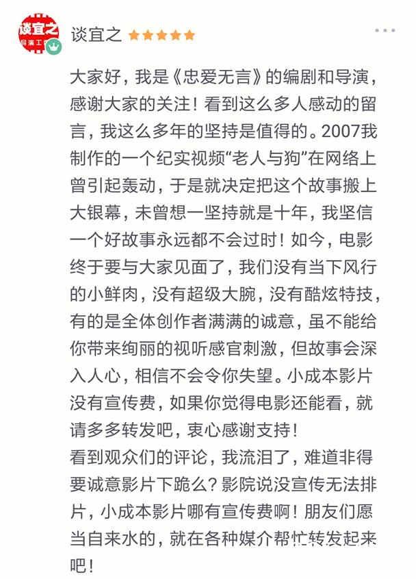 导演谈宜之,曾担任管虎影视公司主任,并参与创作了黄渤主演的电视剧《生存之民工》。2007年,根据真实事件制作的纪实短片《老人与狗》被评为最悲天悯人的故事、年度最佳网络短片。随后花费十年,将这部短片改编成这部叫《忠爱无言》的电影搬上大荧幕。