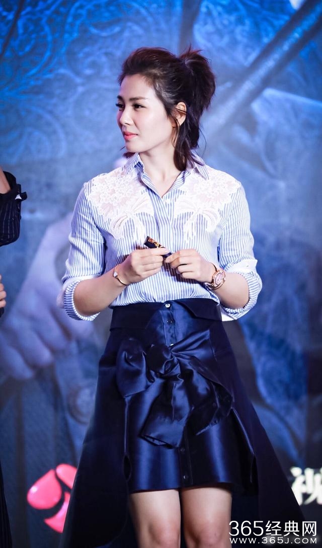 刘涛上衣是蓝色条纹衬衫,肩部的蕾丝装饰既不单调又有女人味。前短后长的不规则半裙很有型,最近很流行这种款式呢!