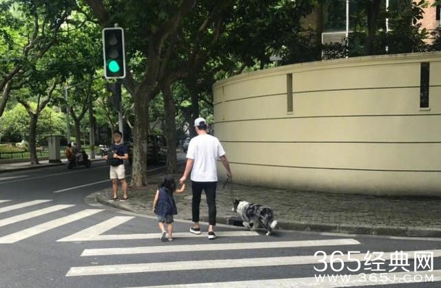 马伊琍在后面为父女拍照,文章牵着小女儿的手,一手牵着狗。