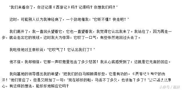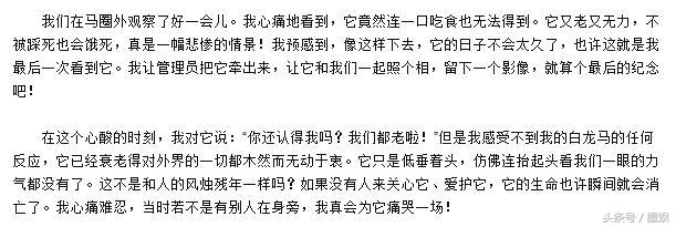 杨洁让管理员牵它出来,给它拍了一张照片用作留念,但未曾想,这一张照片竟然成为它的遗照。第二年,白马就死了,被埋在谁也不知道的地方。
