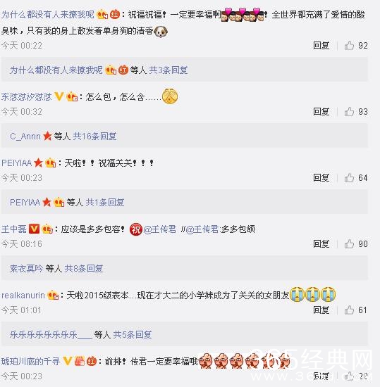 “祝福祝福!一定要幸福啊!全世界都充满了爱情的酸臭味,只有我的身上散发着单身狗的清香。”、“传君一定要幸福!”