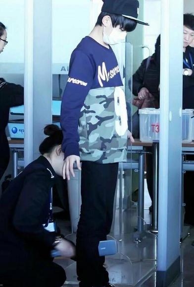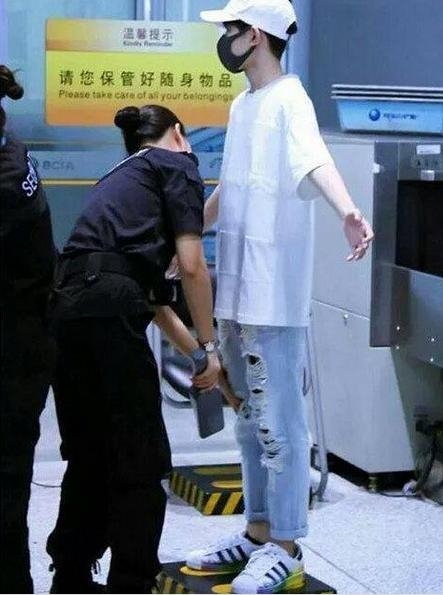 而同样穿破洞牛仔裤的王源则被安检姐姐摸了一下大腿,虽然带着帽子和口罩,但他还是掩盖不住的帅~
