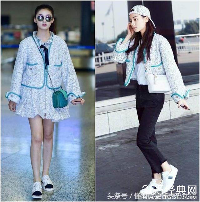 迪丽热巴和林允同穿了一件喷香奈儿外衣,显着就很贵啊,可是林允却穿的很土头土脑,迪丽热巴搭的黑色微喇裤更显时尚感。