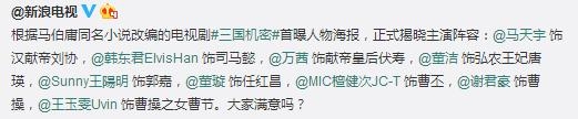 说到唐人,最近虽然损失了诗诗这员大将,但是蔡艺侬的眼光依旧老辣,最近又发掘一部IP历史大制作,改编自马伯庸的同名历史小说《三国机密》,由马天宇、韩东君、万茜、董洁等领衔主演。