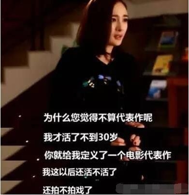 还有一次,记者问杨幂《小时代》是否为她的代表作,这个问题实在是不好回答,除了要照顾自己演技,还得不能伤了她和郭敬明之间的感情。大幂幂机智回称:为什么您觉得不算代表作呢?我才活了不到30岁,你就给我定义了一个电影代表作,我这以后还活不活了,还拍不拍戏了?(怼得漂亮)