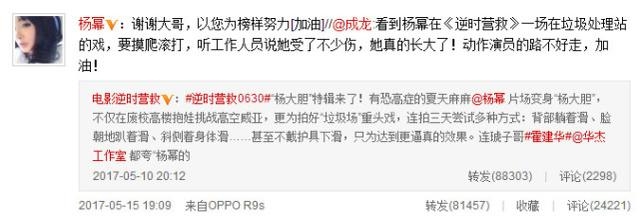 杨幂再得到成龙的夸奖后也对为此做出了回应,并表示要多像成龙大哥学习!