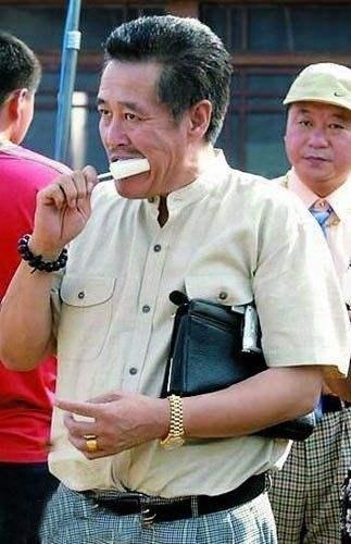 也许是天气太热了,赵本山手上穿金戴银,手握名包,但是就这么不顾形象的吃起了冰棍,而后边范伟的眼神也是说明了很多问题啊!