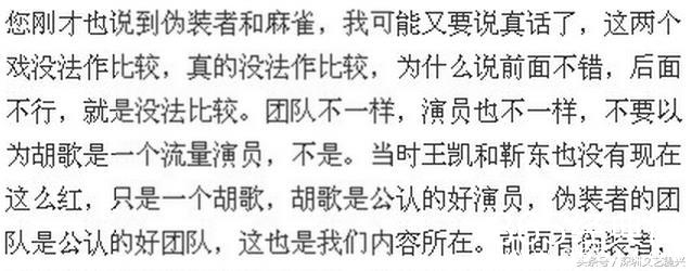 之后,在被要求比较《伪装者》和《麻雀》这两部谍战剧时——