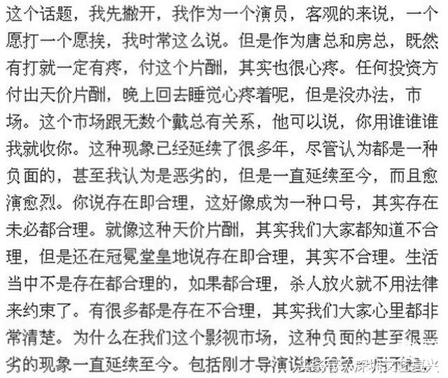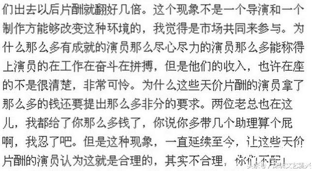 “这个现象不是一个导演和一个制作方能够改变这种环境的,我觉得是市场共同来参与。为什么那么多有成就的演员、那么尽心尽力的演员,那么多能称得上演员的在工作在奋斗在拼搏,但是他们的收入,非常可怜。为什么这些天价片酬的演员拿了那么多钱还要提出那么多非分的要求。这种现象,一直延续至今,让这些天价片酬的演员认为这就是合理的,其实不合理,你们不配!”