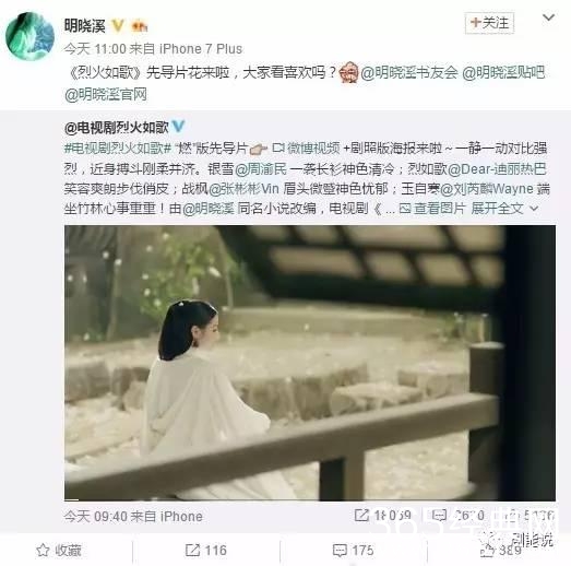 《烈火如歌》的原著作者明晓溪也用微博转发了这款先导片。