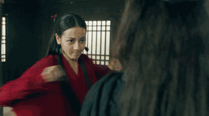 热巴的这场打戏,因为画面的场景色调偏暗,就将一袭红衣的她衬托得明亮很多,再加上热巴本身是舞蹈专业出身,无论出拳还是挥剑,都做得很自然。