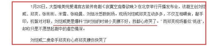 再拍《寂寞空庭春欲晚》这部古装剧时,刘恺威就曾当记者的面说了郑爽腰伤的事,更是心疼哭了。