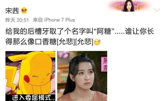 宋茜晒出了自己在《王牌对王牌》中扮演包租婆破口开骂的照片,也露出了自己的洁白的后槽牙。另外还略带幽默的给自己的后牙槽取名叫“阿糖”。