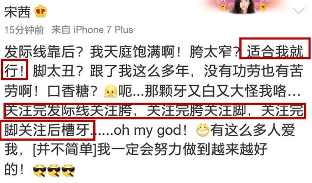 关注完发际线关注胯,关注完胯关注脚,关注完脚关注完后牙槽,也是让宋茜感觉很无语!对比黄晓明也在第一时间转发微博,表示支持,两个人相互鼓励前行。