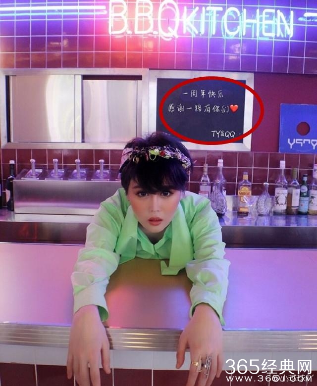 照片中赵本山女儿身穿绿色衣服,化着浓妆,但照片的亮点却是后面的背景板,上面写着:“一周年快乐,感谢一路有你们,TY&QQ。”