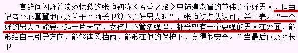 曾被问道顾长卫是不是好男子时,她允许认可,还说道:“一个好的男子也许撑起一片天空,女孩不论多强悍,都期望有一个更强的男子在外面。”关于顾长卫的赞许之情溢于言表。