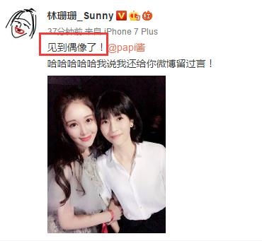 活动后台林珊珊还晒出了自己跟papi酱的合影,称见到了自己的偶像,还在papi酱的微博下面留言过,也是一枚小粉丝无疑了。