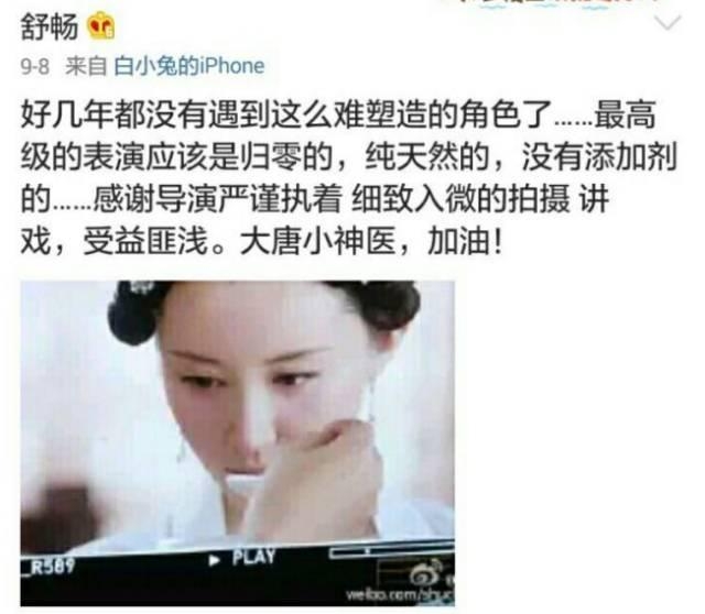 翻翻其他小花旦的微博,大多都在晒美照,晒生活,舒畅却常常在微博上分享自己对演员的感悟——