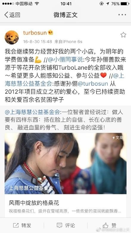 而据网友爆料,孙俪店里收到的东西都很新很干净,而且超级良心的价格,很好的环保理念卖到的钱也是捐给一个贫困生机构的。