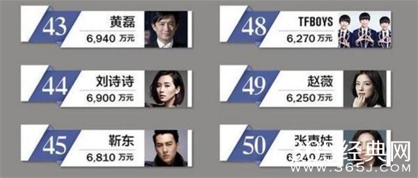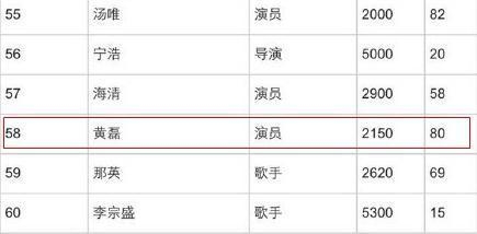 2015年福布斯中国名人榜上,黄磊的年收入为2150万元,收入排名第80。而根据界面与今日头条联合发布的“2017年中国名人收入排行榜”显示,黄磊2016年的年收入为6940万元,一跃排名第43位。