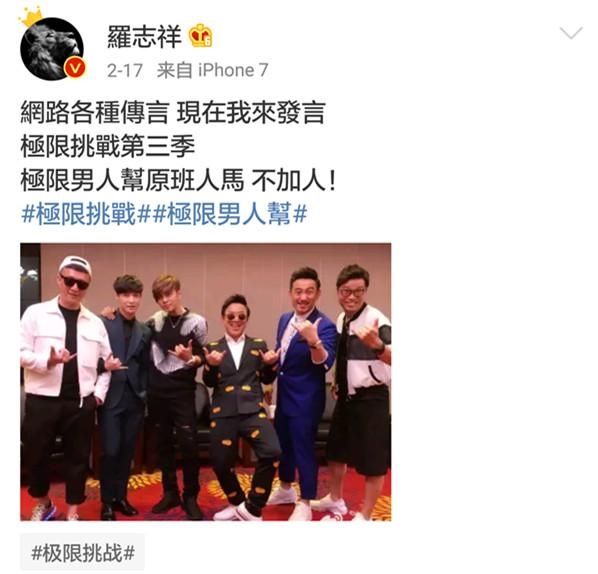 早前罗志祥就在微博透露,《极限挑战》第三季还是原班人马,不加人也不减人。