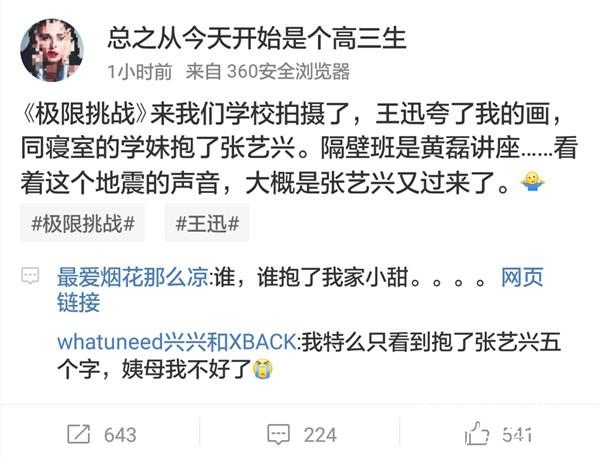 据她爆料,《极限挑战》正在她们学校录制,王迅夸了她的话,舍友还抱了张艺兴,黄磊正在隔壁班讲课。而且每一次张艺兴出现,都会引起“地震的声音”,显然小绵羊很受欢迎。
