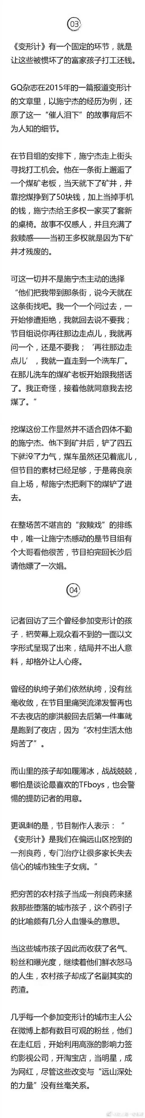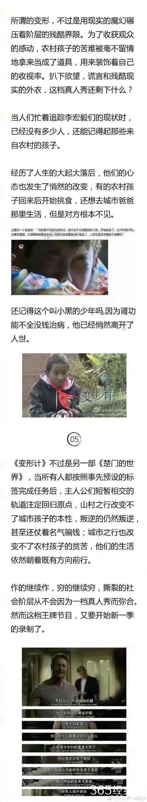 我并不是在讽刺此档节目,其实在很多教育工作者看来,《变形记》的确有很多不妥之处,一个本是贫穷的孩子,在经历过灯红酒绿的城市生活之后,又让他回到贫穷,落后的农村生活,这对孩子一生的影响不言而喻,而城市孩子却因此得到更好的发展,更好的星途,种种对比起来,实在让人心寒。