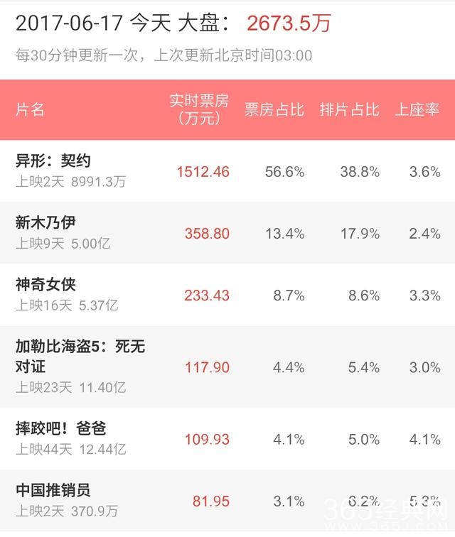 好莱坞大片一如既往的在国内市场大卖,截止今日3时,《异形:契约》的票房已经达到8991万,票房占比56.6%,小编看好的《中国推销员》,《重返狼群》,暂时未有什么爆发表现,不知几天后会如何。