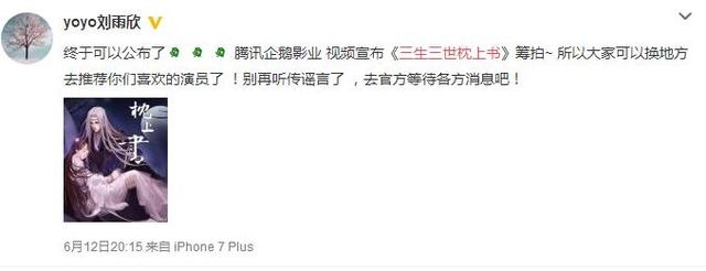 本来以为《枕上书》已经定了角色,可是前几天的一则新闻爆出《三生三世枕上书》确定由企鹅影视进行开发,所以刘雨欣不再是制片人,